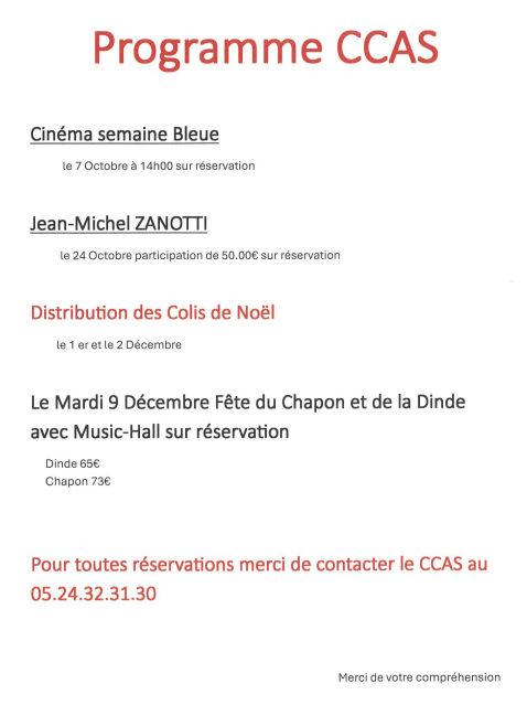 pour toute inscription, veuillez-vous rapprocher du CCAS ou par téléphone au 05.24.32.31.30 réservation avant le 15 Août.