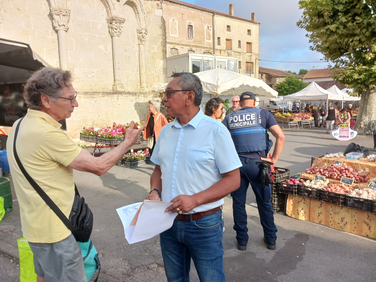 Le maire en personne assisté de Jean Jacques Lassarade, conseiller municipal, étaient sur le pont dès 6H du matin pour pallier à l'absence des placiers du marché hebdomadaire. Ils ont été ensuite remplacés par André Forget adjoint aux finances et un policier municipal.